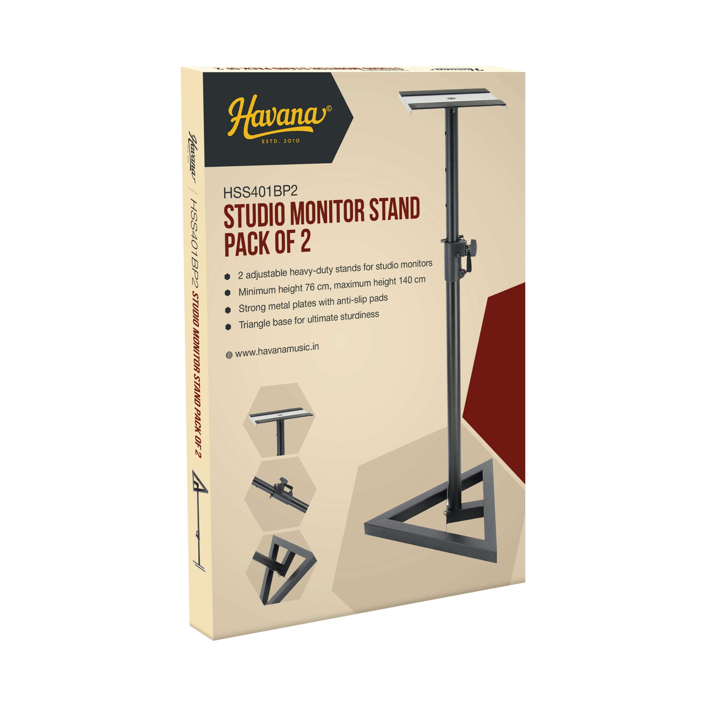 Get the perfect studio setup with the Havana HSS401BP2. This pair of heavy-duty adjustable stands offers rock-solid support for your monitors, with sturdy triangle bases, anti-slip EVA pads, and height adjustment from 76 to 140 cm. Built to handle up to 50 kg, they’re designed for both professional studios and home setups.