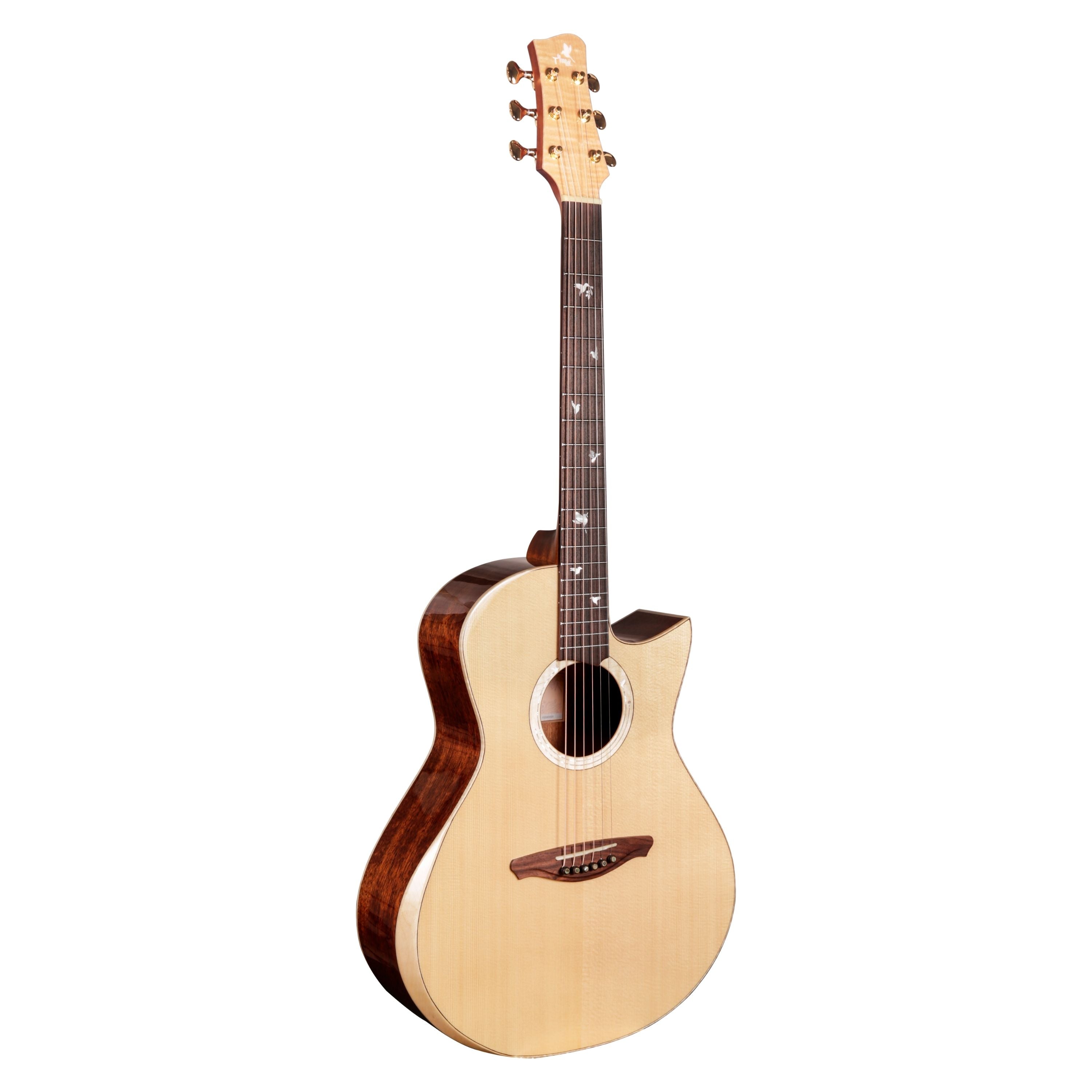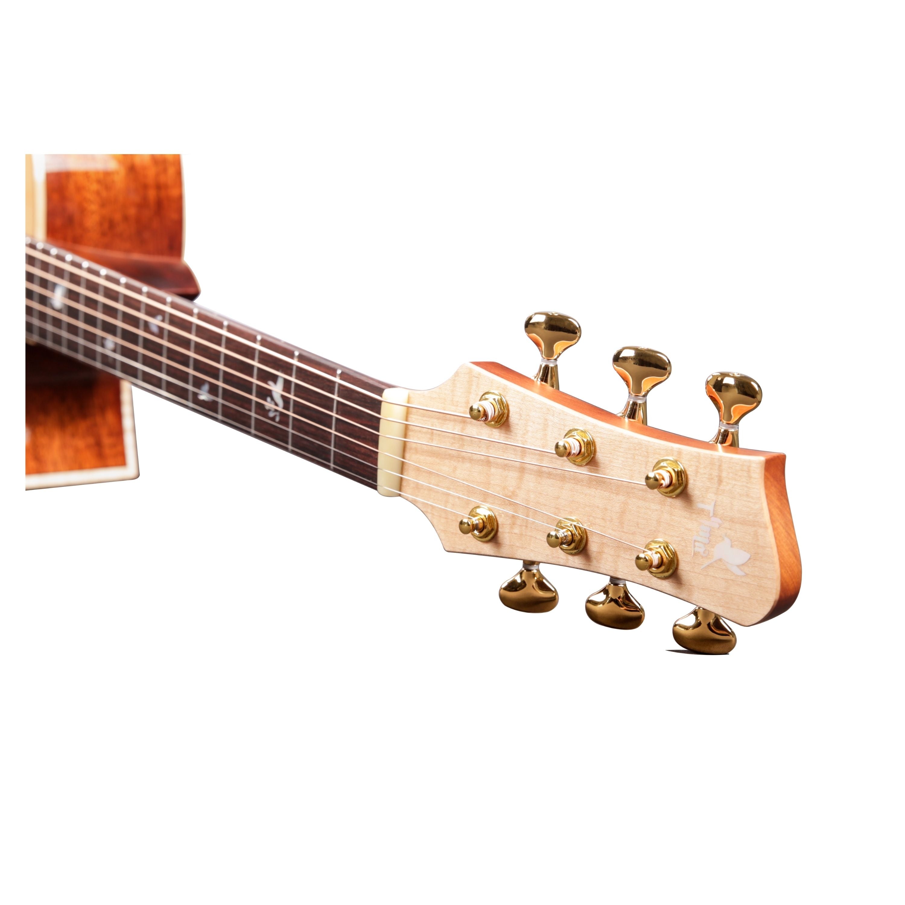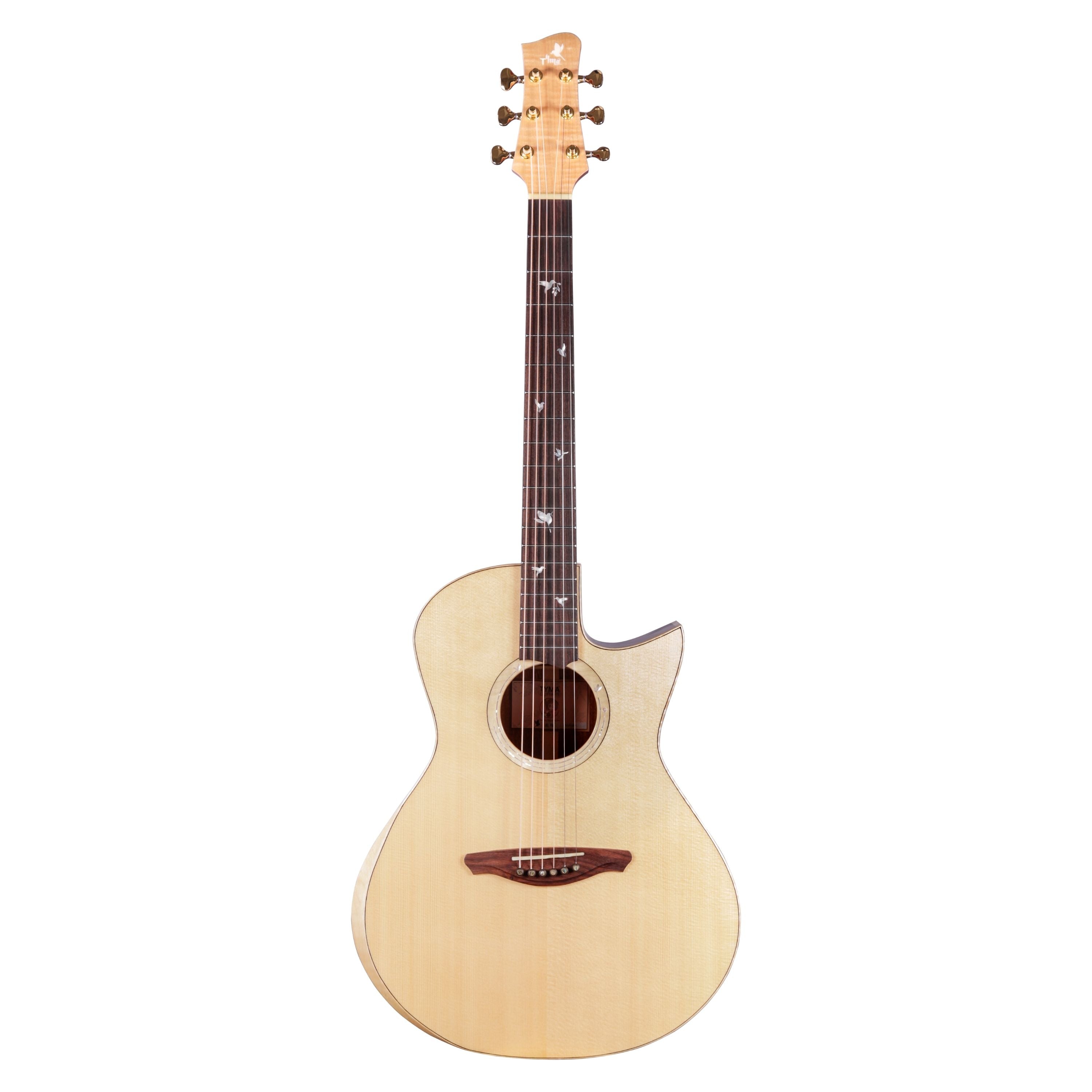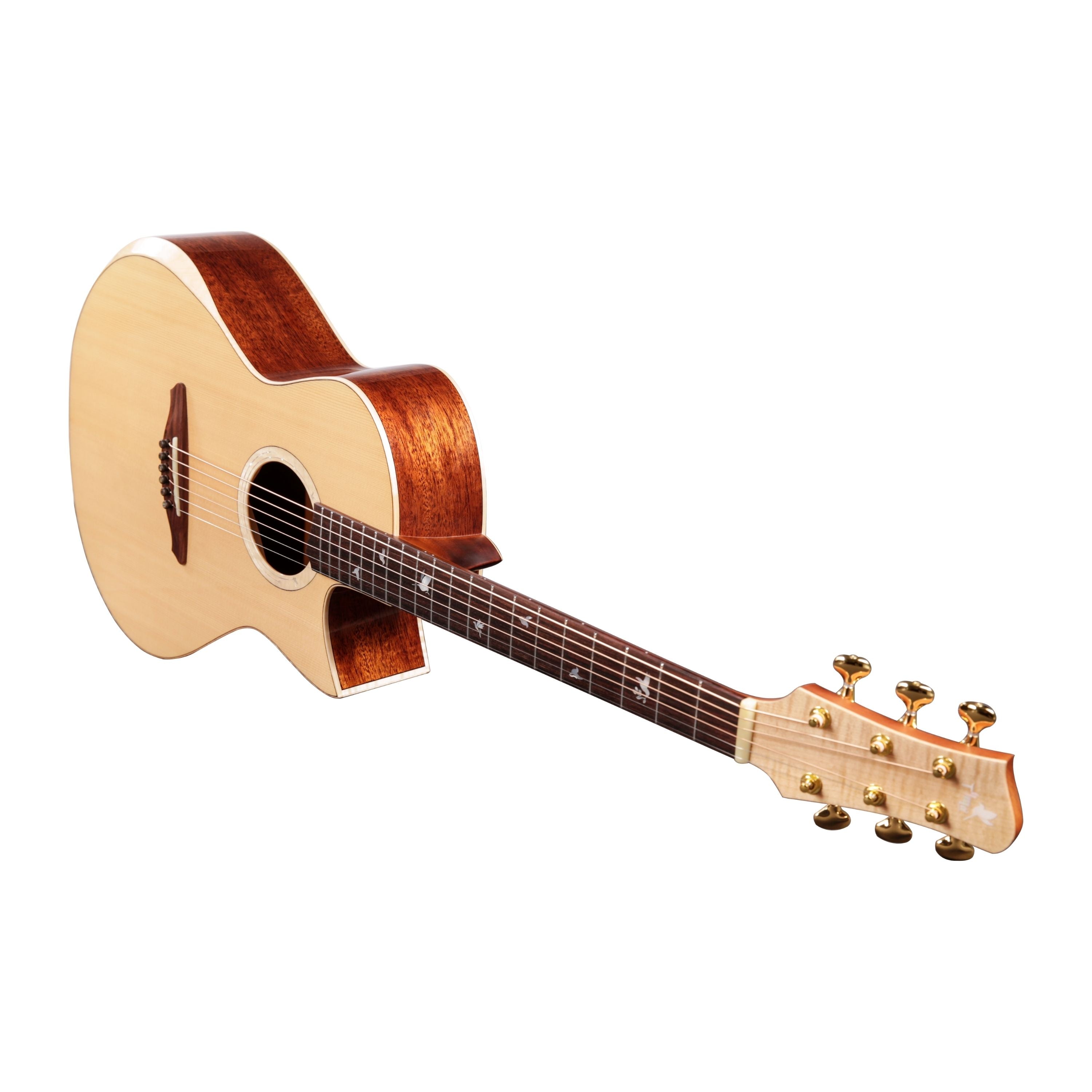 The Solid Sitka Spruce top and Solid Mahogany back and sides are voiced with Tyma's V-Bracing to maximize volume and resonance. Visually, it is a work of art, featuring stunning Tiger Maple binding and delicate Abalone bird inlays taking flight across the fretboard.