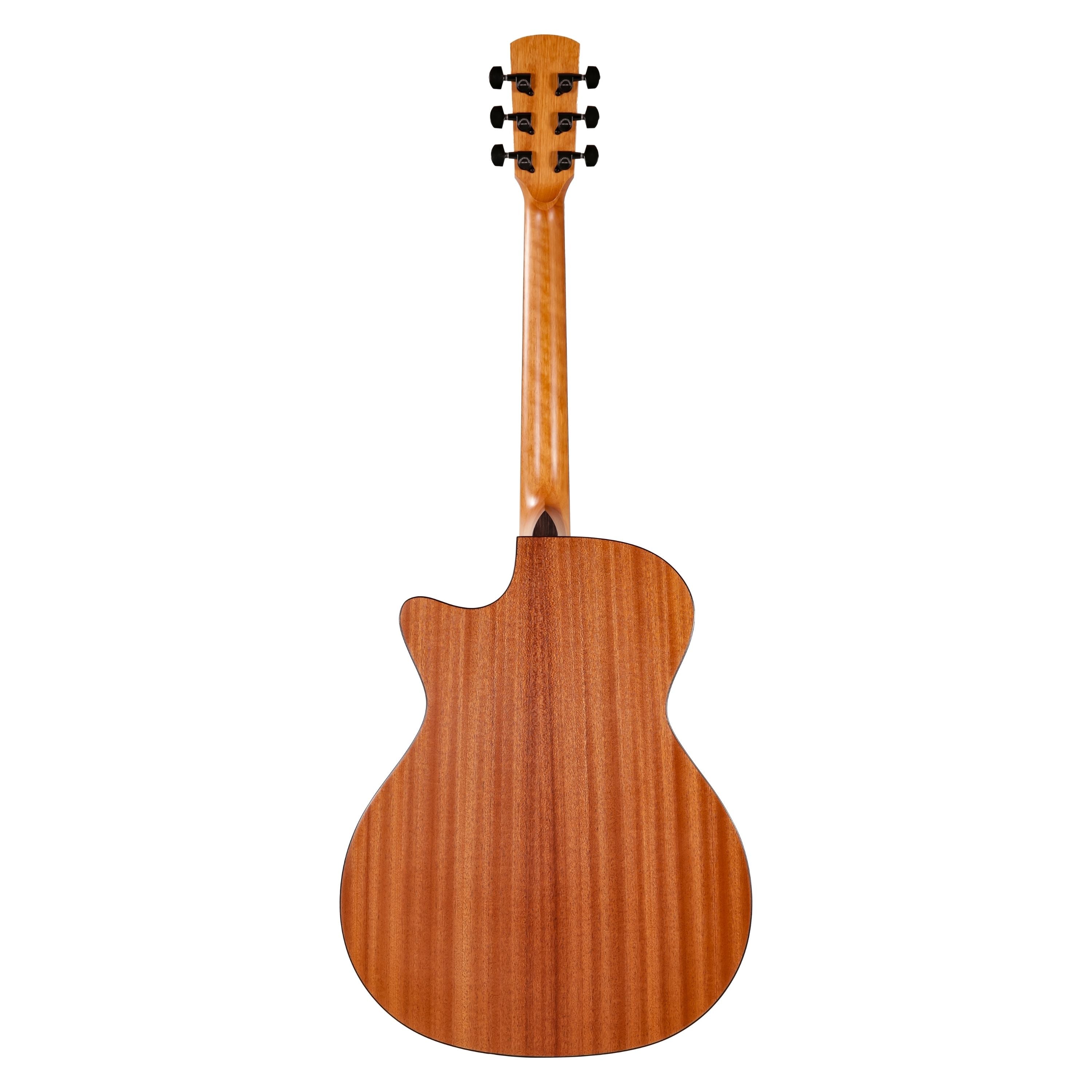 Classic Tonewood Combination: Pairs a Sitka Spruce top for dynamic projection with Sapele back and sides, known for its mahogany-like warmth and depth.